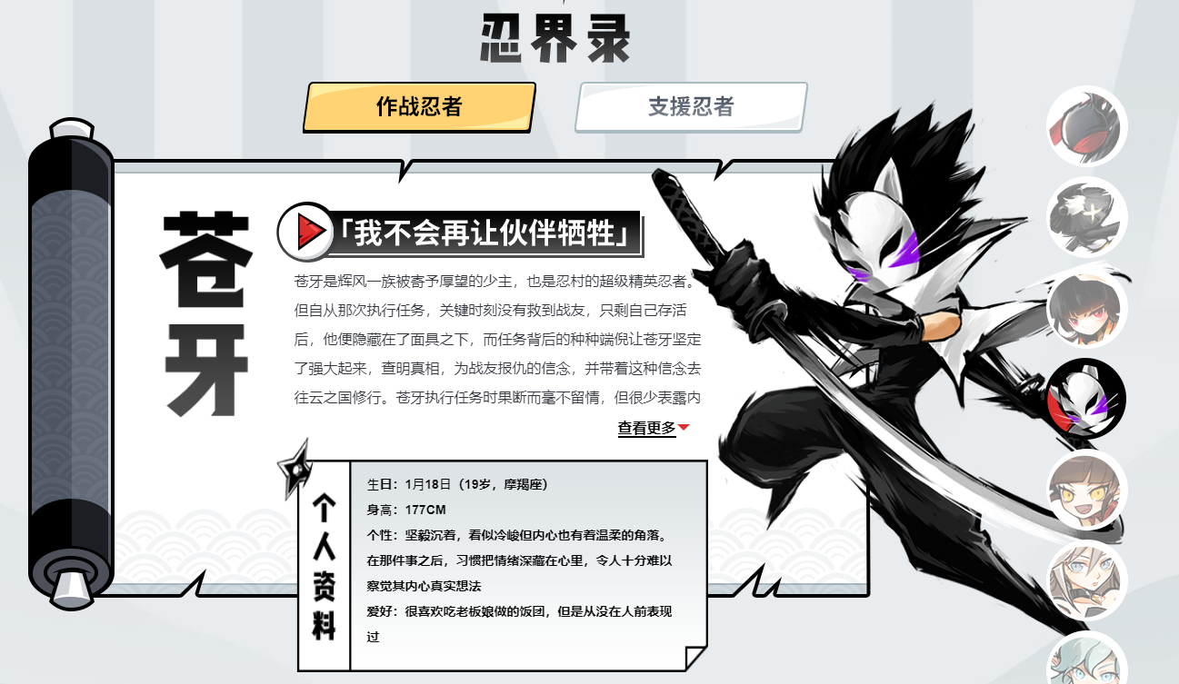 苍牙是一个超级精英,实力强大的风系忍者。且刚从云之国修炼归来,力量得到进一步的提升。因为在执行一项任务的过程中失去了战友,苍牙带上面具,风系天赋踏风的存在让苍牙可以随心所欲的四载三段跳,能通过自由跳跃闪躲敌人的攻击,是最实用的天赋了。