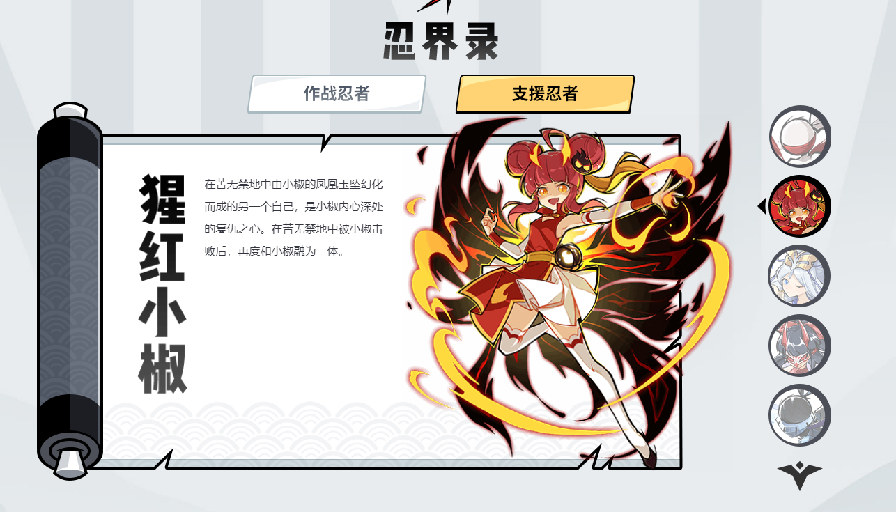 小椒是超重神火一族的幸存者,被冷却厨神外出历练时救回一直在竹叶中生活成长。因为女婴时手中紧握一枚辣椒而得名。为了寻找自己的身世,参加了忍者考试,成为了一名忍者,小椒的天赋轻功能让小椒使用三弹跳,对她的操作性和生存有很大的提升。