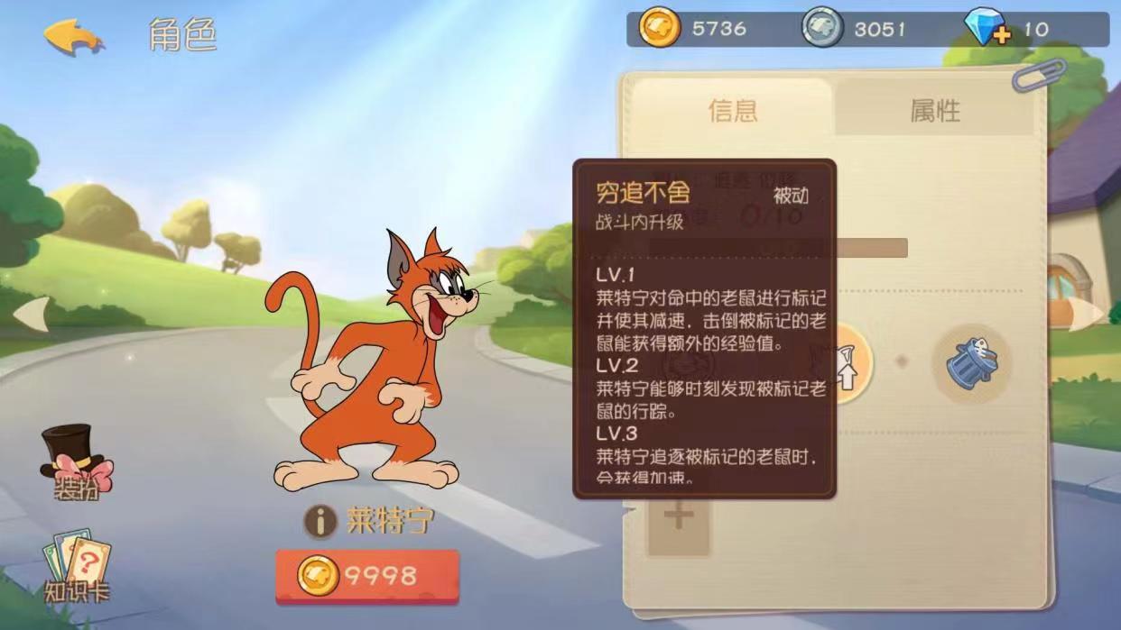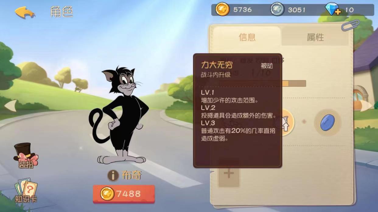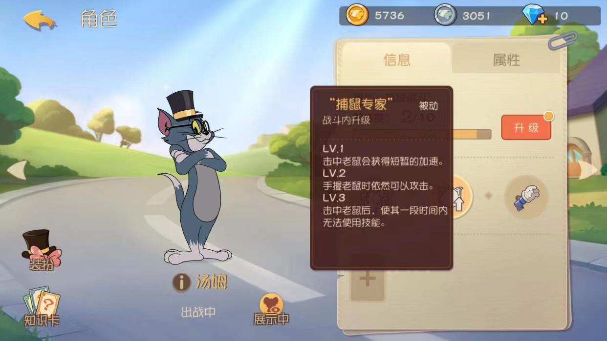 汤姆是猫咪正营当中的一个老牌角色,它的优点就是血量很高,并且很耐打,汤姆的身手很敏捷。在游戏当中定位是耐打,持久类型的,它的一个被动就是它的一个神级技能,击中敌方以后可以加速,并且手上有老鼠的时候还可以攻进其它老鼠,这让在跟自己对抗的老鼠方显得无所适从呢。