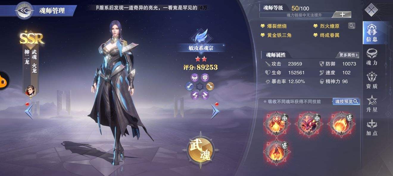 首先第1个被动技能是这一名魂师从上线之后就一直保留的一个核心的被动,它的最大效果能够在队友死亡之后,刘二楼还能够继承队友的部分攻击和生命值属性。并且在当队友都挂掉之后。柳二龙能够进入持续4个回合的暴怒状态,这个时候他的速度和爆发力会有着巨大的提升。基本上在pvp的战斗环境当中,只要不是双方的战力差距比较大,进入暴怒状态的柳二龙是可以使用一个一技能或者是4技能直接带走我方的魂师队友的。