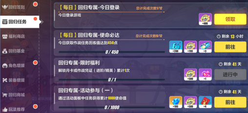 随后就是很多人都在说的回归任务,5.9版本更新后,将调整部分回归任务和奖励,删除了水晶体验和体力历练任务,新增活动参与和往世乐土相关任务。而且还有加速卷可以领,大大的减负了啊。