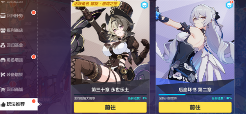 所谓“减负”也就是可以给玩家更为便捷的游戏体验,这点以5.9版本为例,5.9版本更新后,在回归活动界面将新增「玩法推荐」面板,展示近几个版本中最重要的版本活动,这里MIKI还是推荐舰长们优先体验一下这个活动内容,因为如果我们在这里完成任务,可以获得「爱酱硬币」奖励,用于在「福利商店」中兑换水晶、SP角色卡等奖励。