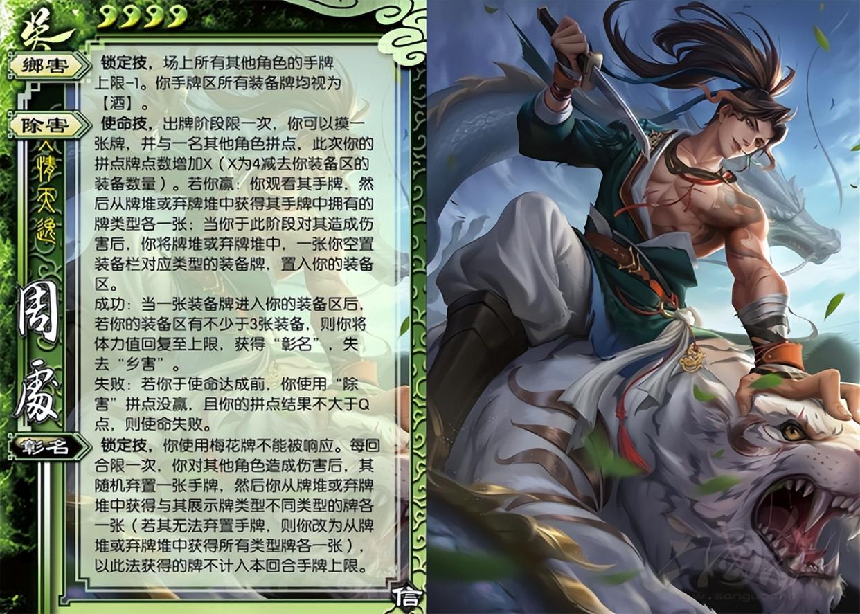 第1个就是周处。在传说中,周处其实是一个很神奇的人,他替百姓除掉了二害,一个是老虎,一个是蛟龙。传说中的第三害就是他自己,虽说自己不能除掉自己,但是这也反映了周处是一个非常有胆识有魄力的人,而在三国杀中他的实力也确实很强,他的技能特效就是可以让场上所有角色的手牌上限都减少一个,并且他还有额外摸牌的能力,无论是输出能力还是中途的牵制能力,都是很优秀的,如果大家在场上碰到了他千万不要掉以轻心。