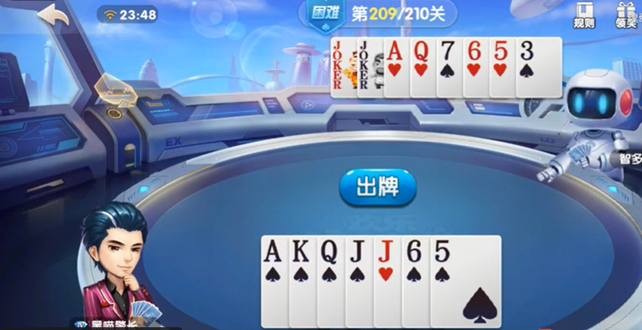 大家好,这里是游戏日报云澈。在欢乐斗地主这一款游戏的困难残局当中,目前第209关大家自己手中所持有的牌型是5、6、JJ、QQ,对方的牌型是3、5、6、7、Q、A、小王、大王。在这一对局里面首先玩家可以选择打出自己手上的对J,对方不出再选择打直接手中的单张5,对方出单张6再选择打单张Q。