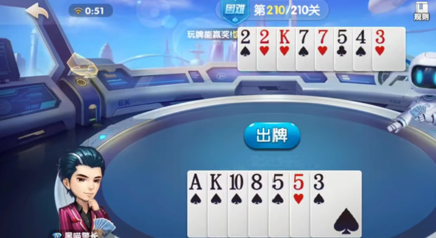 对方出单张K再选择打单张A,对方出单张2再选择不出,对方出对7再选择不出,对方出单张3再打单张5。对方出单张2再选择不出,对方出单张4再打单张8,对方不,再打单张10和单张K,对方不出再打一个单张三就获得了残局的胜利。
