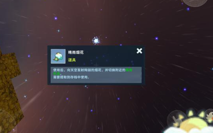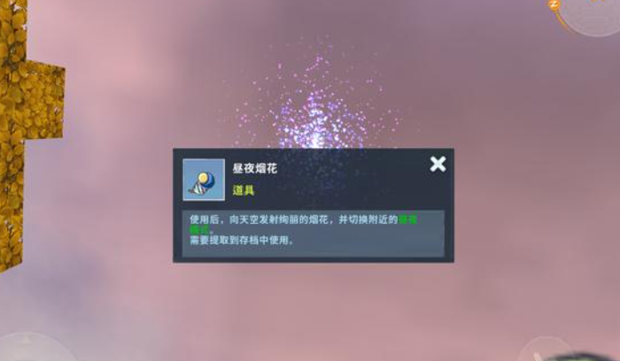 就比如说昼夜烟花,它能够改变游戏当中的时间,如果我们在夜晚的时候将烟花放上天空,那么等烟花爆开之后,游戏内的时间就会来到清晨,这种烟花对于新手玩家来说是非常大的福利,因为我们只要在夜晚来临的时候放上一颗烟花,那么我们在没有装备的情况下,就不用害怕黑暗当中怪物的骚扰了。