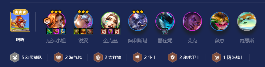 开局优先抢无用法棒或者巨人腰带; 优先合成狂徒铠甲或者日炎斗篷,保证前中期的连胜 前期尽量用幻灵战队+吉祥物过度,中期可以小搜一波找到维克兹或者索尔过度,二星的金克丝在七人口有些许的乏力,尽快上八人口搜到女枪才可以锁血。