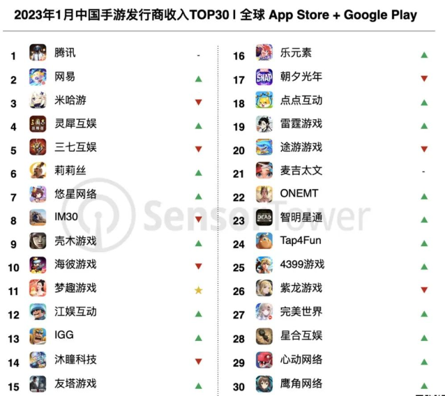 Sensor Tower发布2023年1月中国手游发行商全球收入排行榜