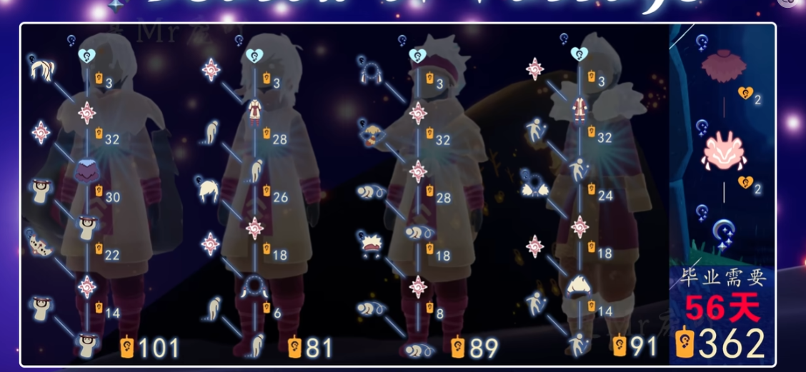 新季节总共会迎来四个先祖,全部解锁总共需要花费362根季节蜡烛,有季卡的话毕业需要56天。而这个季节无需季卡能够兑换到两个衣服,一个斗篷一个发型,高人气的耳坠都需要季卡。