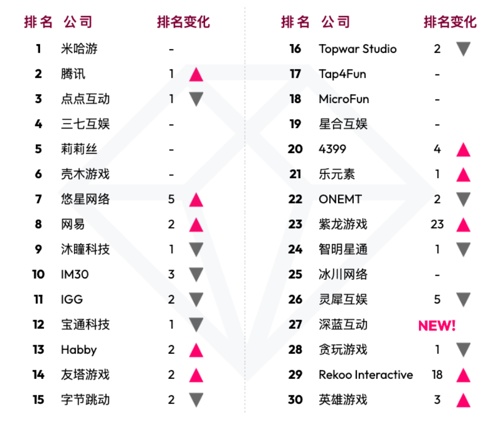 data.ai发布2023 年 11 月中国游戏厂商及应用出海榜单,米哈游凭借原神的收入增长继续占据发行商收入榜首位置,腾讯海外发行的胜利女神:妮姬在一周年活动期间,收入提升 35%,使得腾讯超过点点互动来到第二名,悠星网络本期上升5位进入前十,得益于旗下游戏明日方舟和雀魂的增长。
