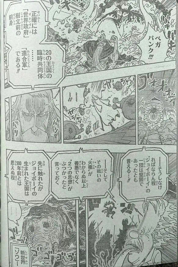 第1114话贝加庞克表明「空白100年历史的主人公是乔伊·波伊」,1115话里他继续表示「乔伊·波伊的敌人是世界政府的前身,由20个王国组成的联合军」画面中乔伊·波伊跟敌人战斗时,也明显是尼卡形态。「只不过,那场战斗以乔伊·波伊的败北为结束,存活至今的佐乌象主和巨大远古机器人都曾经是他的同伴,也是那场战斗的经历者。」