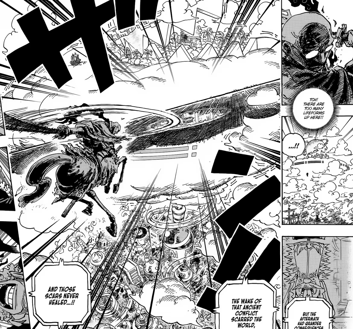 这一话里,贝加庞克向全世界宣布了炸裂般的空白100年历史真相,让五位五老星倍感威胁,大显神威!纳斯寿郎圣挣脱了波妮、山治等人的束缚,拿起剑,一道斩击直接砍断了艾尔巴夫的船首。紧接着,他直接冲向岛屿上空,砍出一道巨型斩击,直接将研究层的实验室砍成两半,实力恐怖!