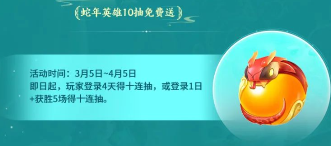 在3月5日-4月5日期间,游戏还会开启免费送十连的活动,玩家只需登录4天或登录后获胜5场,即可获得蛇年英雄免费十连。