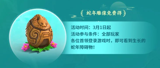 除了主题季限定装扮外,从3月1日开始,游戏还会上线一系列活动。比如在3月1日,“蛇年雕像免费得”活动就会开启,玩家在登录游戏时,即可看到生长的蛇年障碍物。