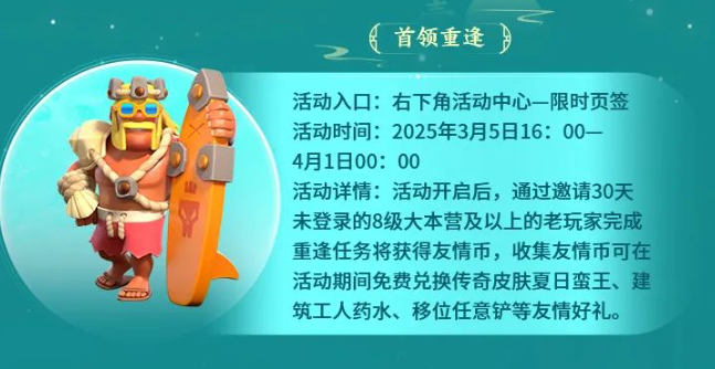 在3月5日-4月1日期间,邀请老玩家回归活动开启,玩家可在该活动中通过邀请30天未登录的8级大本营及以上的老玩家回归。老玩家完成重逢任务奖获得友情币,收集友情币可在或期间免费兑换传奇皮肤“夏日蛮王”、建筑工人药水、移位任意铲等好礼。
