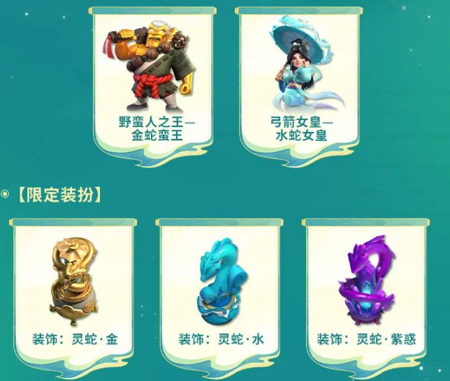 然后是“蛇行天下”主题季中,玩家可通过消耗“腾蛇金珠”来获得蛇年主题季限定装扮。本次有蛮族人之王-金蛇蛮王、弓箭女皇-水蛇女皇等待玩家前去获取。此外,还有限定装扮:装饰:灵蛇·金、装饰:灵蛇·水、装饰:灵蛇·紫惑等待玩家前去获取。