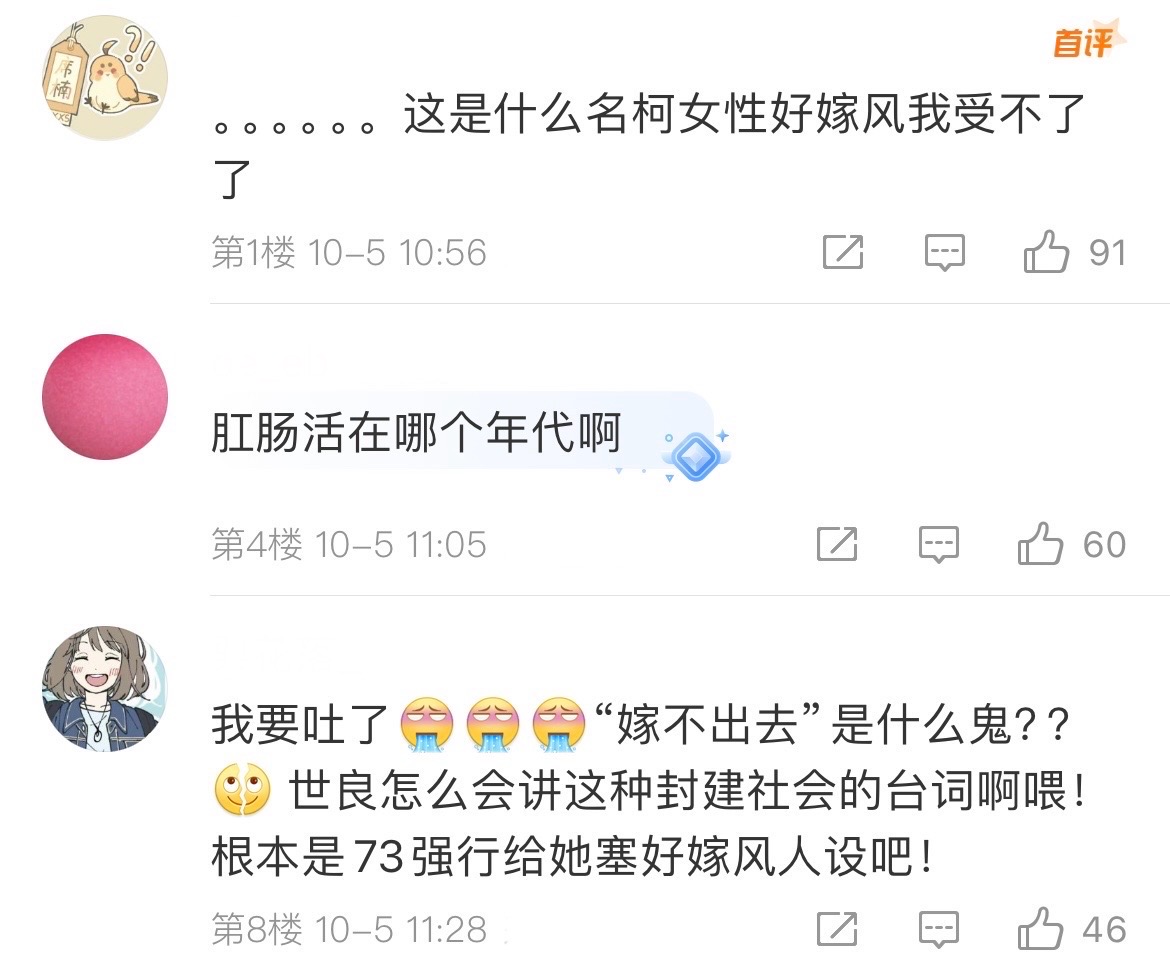 实际上,这一话的案件剧情非常精彩,可世良作为一个洒脱“假小子”人设,却说出了“走光就嫁不出去”这种话,让粉丝十分不适,纷纷吐槽“青山登味儿十足”、“强行给世良塞好嫁风人设”、“又是胖次真恶心”等。那么,各位小伙伴有什么其他观点吗?