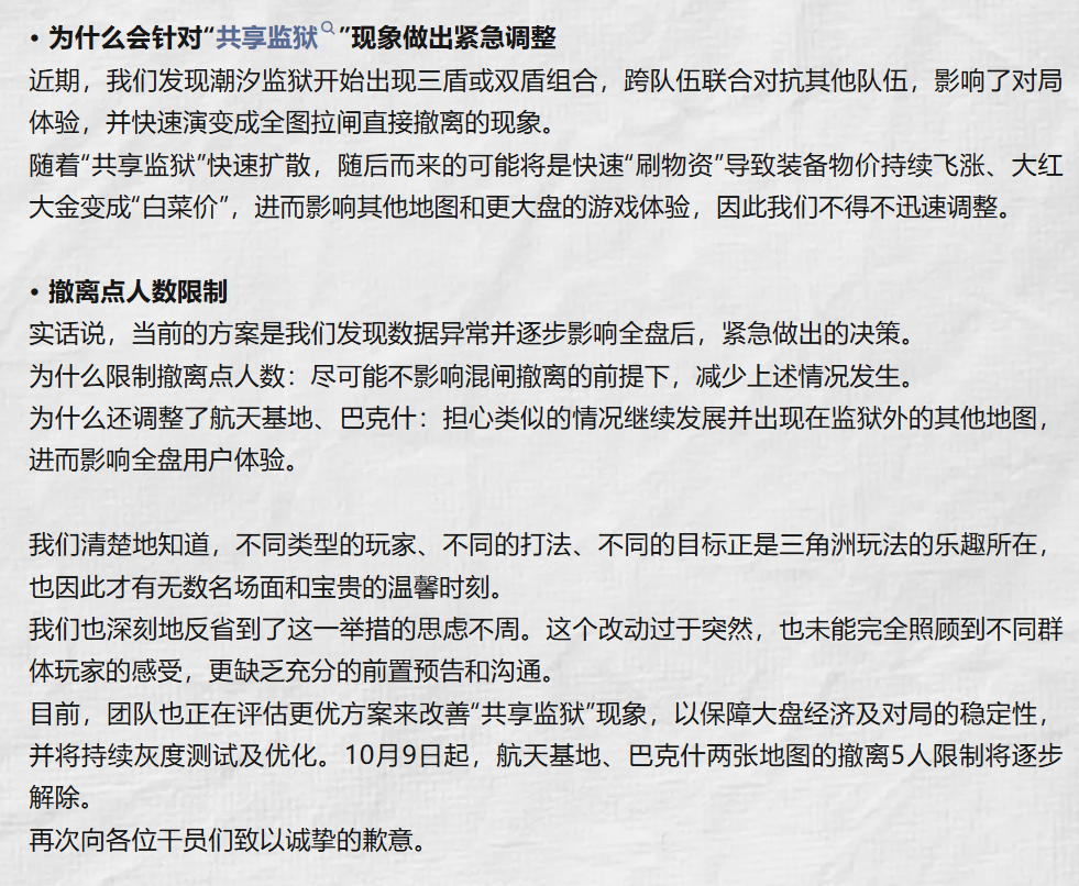 《三角洲行动》就此前烽火地带平衡性调整的措施发布了致歉声明,称给出更完善的方案及灰度测试,从10月9日起,逐步解除航天基地、巴克什两张地图机密、绝密的撤离点人数限制。