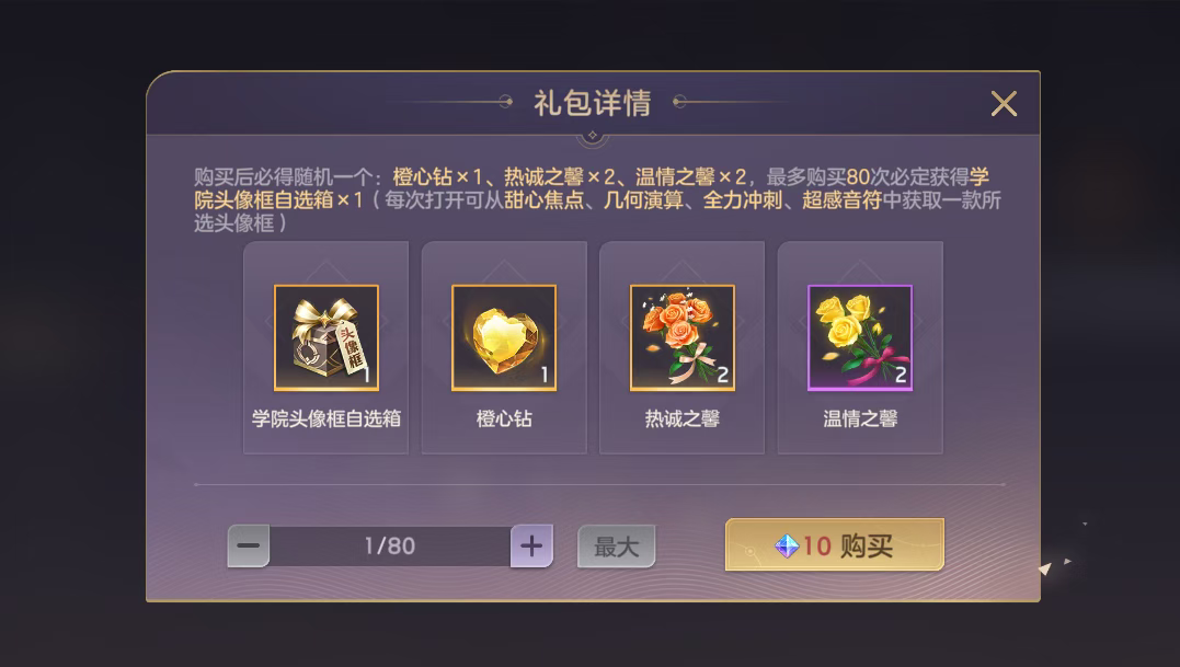 在10月17日-10月31日,“学院秘宝”开启限时售卖,玩家每抽可得任意奖励:橙心钻1、热诚之馨2、温情之馨*2,最多购买80次必定获得学院头像框自选箱(内含甜心焦点、几何演算、全力冲刺、超感音符头像框)。