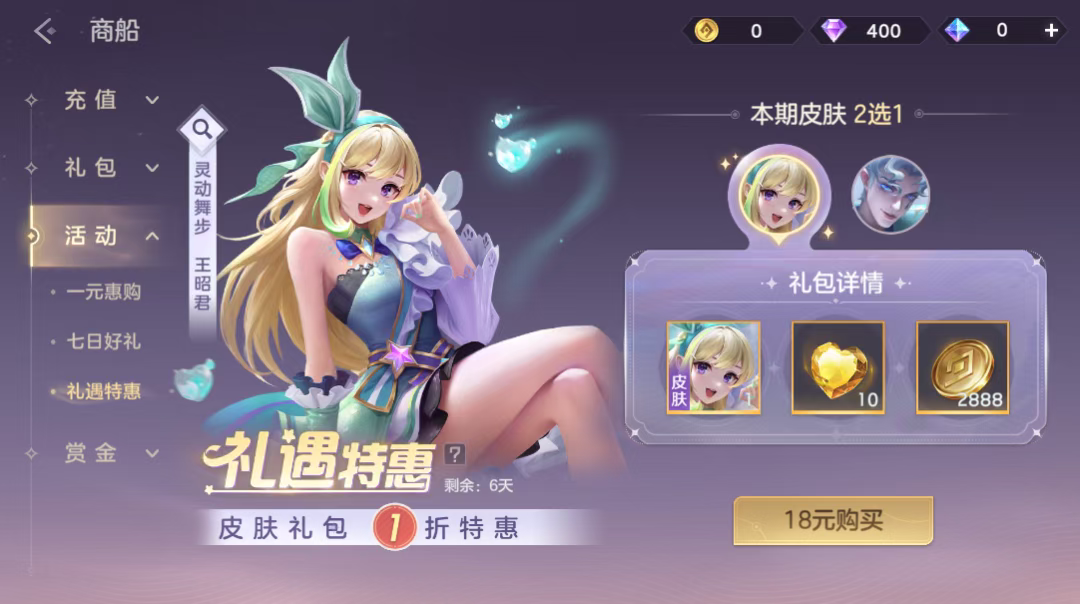 在10月17日-10月24日,礼遇特惠礼包限时1折,仅需18元,玩家即可在王昭君·灵动舞步、伏羲·奇迹大师两款皮肤中超值2选1。
