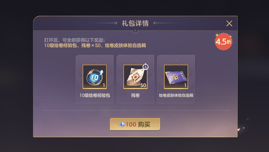 在10月17日-10月24日,“绘卷礼包”限时开启,玩家可用100钻购买,礼包内含10级绘卷经验包、残卷*50、绘卷皮肤体验自选箱。