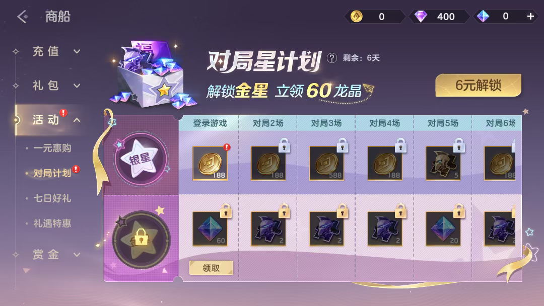 在10月20日-10月27日,“对局计划”活动开启,玩家完成对局任务,提升等级免费获取英雄碎片、金币;付费6元解锁金星可以获得龙晶*120、龙魂祈福卡、皮肤碎片。