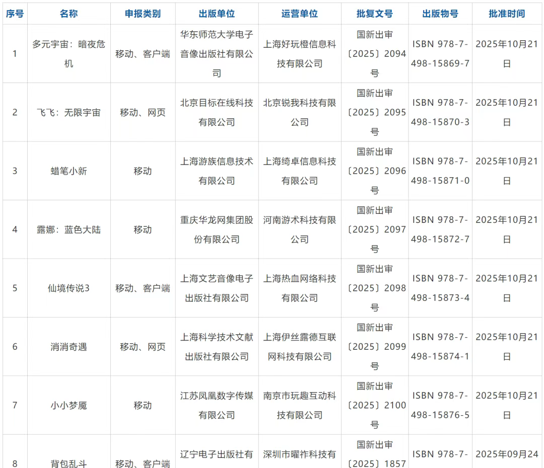 2025年10月22日,国家新闻出版署公布了2025年10月份游戏版号审批信息,共有159款国产网络游戏、7款进口网络游戏版号获批。而在10月份总共下放的166款游戏版号里,值得关注的重点产品有:《吉星派对》、《英雄防线》、《凹凸世界:彩虹收藏家》、《萤火远征》、《蜡笔小星》、《仙境传说3》等。