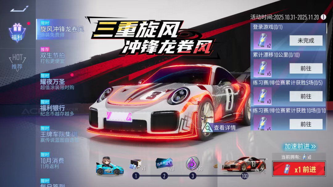 10月31日-11月20日,“旋风冲锋龙卷风”活动开启,活动期间玩家完成任务即可领取王牌能量道具,助理赛车手前进拿奖励,前进越多奖励越多,终极大奖为“涂装-3号赛车”,喜欢的玩家记得多做活动任务。