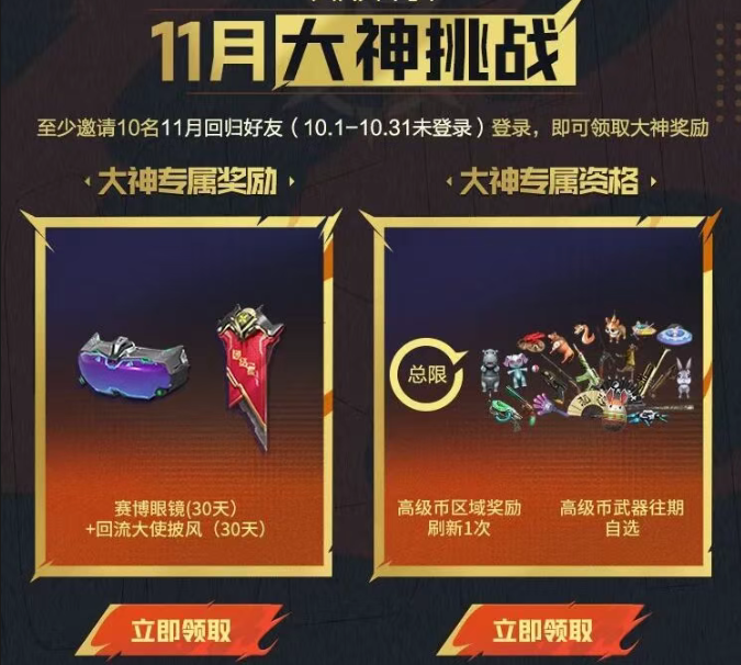 在11月大神挑战中,玩家只要成功邀请至少10名10月整月未登录的回归好友重新上线,就能解锁大神专属奖励,包括赛博朋克风格的赛博眼镜(30天)与回流大使披风(30天),还能获得大神专属资格。