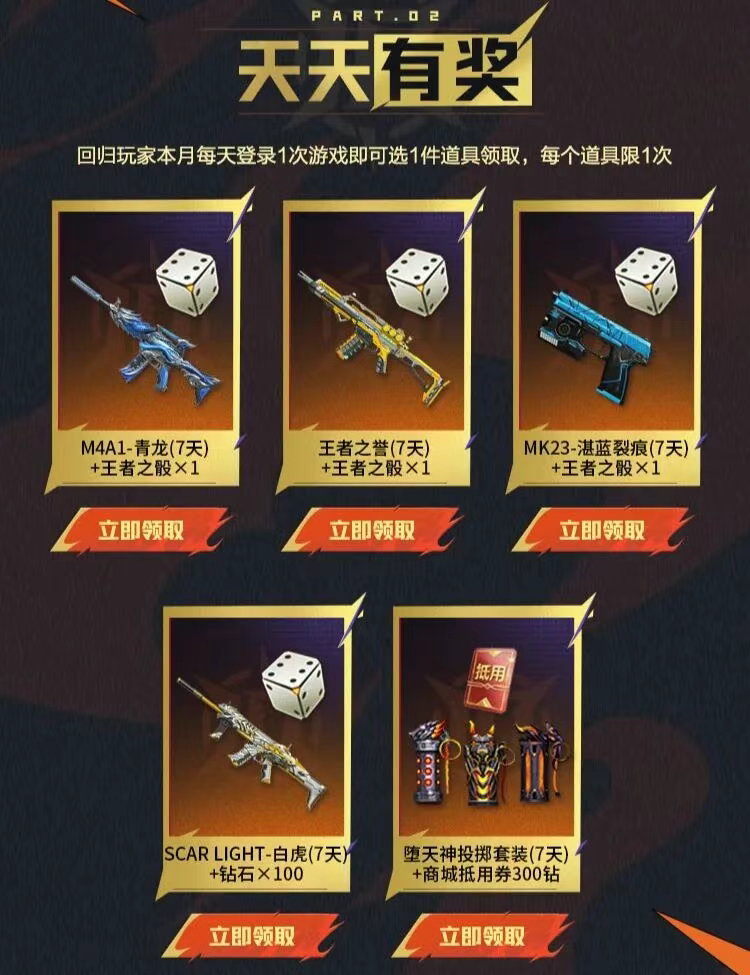 11月期间,回归玩家每天登录一次游戏,就能在“王者之誉(7天)+王者之骰”等组合中任选一组领取,每组限领一次。