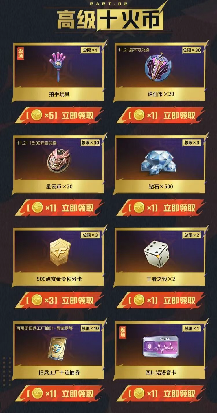 高级十火币区则覆盖多品类需求,不仅有拍手玩具这类趣味道具惊喜返场,还有诛仙币、星云币、钻石、赏金令积分卡、王者之骰、旧兵工厂十连抽券与四川话语音卡,攒够高级十火币就能直接抱走。