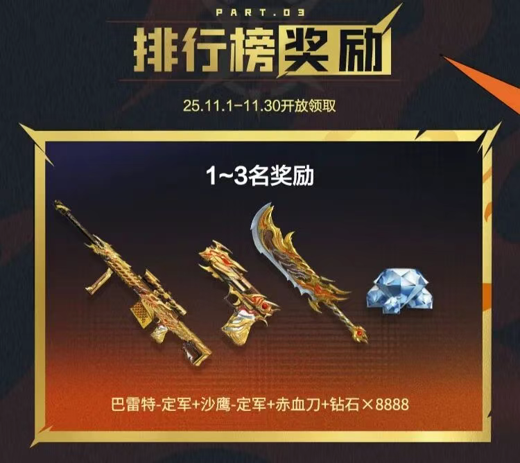 而大神排行榜则将福利升级,排名越靠前奖励越丰厚:前三名可获得巴雷特-定军、沙鹰-定军、赤血刀与8888钻石。4至10名能斩获AK47-波塞冬、沙鹰-波塞冬与6666钻石;11至50名可领QBZ03-枪娘、分裂雷与3888钻石。