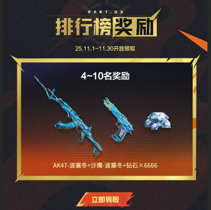 51至100名有尼泊尔-火麒麟、烟雾弹-天使与1888钻石;101至500名也能拿到皮肤M4A1-死神-秘银与888钻石,无论排名如何,都有惊喜相伴。