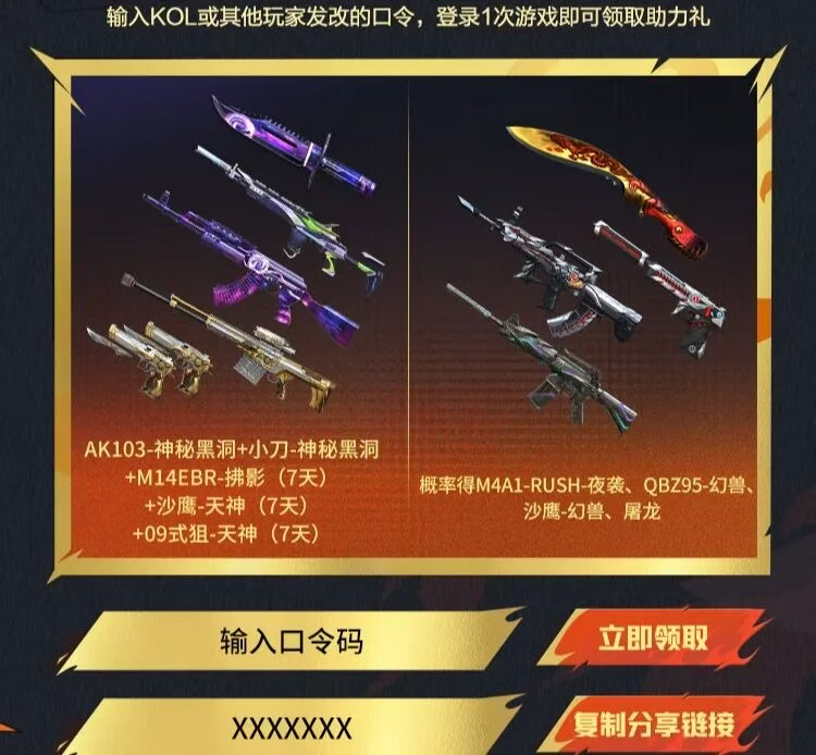 除了模块内的福利,还有个隐藏惊喜——专属码福利。只需复制KOL或其他玩家分享的口令码,再登录一次游戏,就能轻松收入AK103-神秘黑洞、小刀-神秘黑洞、M14EBR-拂影(7天)、沙鹰-天神(7天)、09式狙-天神(7天)这些豪华奖励,更有概率抽到M4A1-Rush-夜袭、QBZ95-幻兽、沙鹰-幻兽与屠龙,赶紧和好友互相分享专属码,一起把奖励拿满。