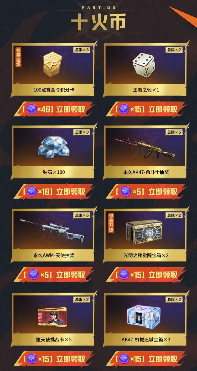 另外,十火币区同样诚意十足,本期宝库普通币区赏金令积分卡迎来回归!另外还有王者之骰、钻石等你兑换,永久AK47-角斗士、AWM-天使可抽。更有光明之秘觉醒宝箱、AK47-机械迷城宝箱以及堕天使挑战卡也在等待大家。