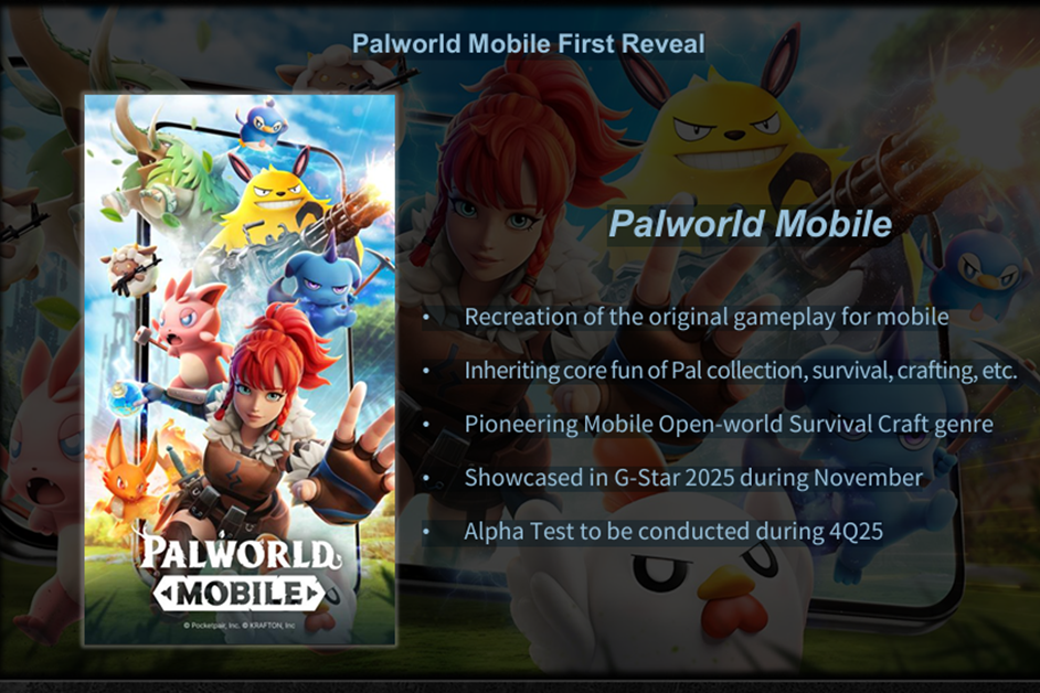 Krafton财报透露,由Pocketpair授权、Krafton开发的开放世界捉宠生存游戏《幻兽帕鲁手游》定于2025年第四季度进行Alpha测试。《幻兽帕鲁手游》将还原《幻兽帕鲁》中的核心趣味要素,如收集、生存、制造等内容。