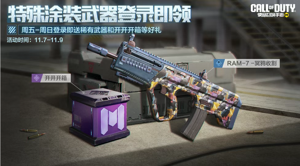 11月7日,周末登录礼活动来袭。玩家周末登录游戏,即可获得稀有级武器RAM-7-冥鸦收割、开开开箱和福利点券等奖励。