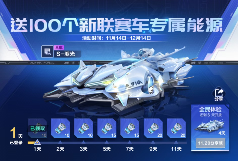 从11月14日起,“140个溯光专属能源免费送”活动也在火热进行中,玩家仅需登录游戏即可累计领取100个溯光专属能源。从11月20日起,全民体验S-溯光!车手们每周分享活动页面即可领取S-溯光(4天)、S-溯光满改卡(4天)。
