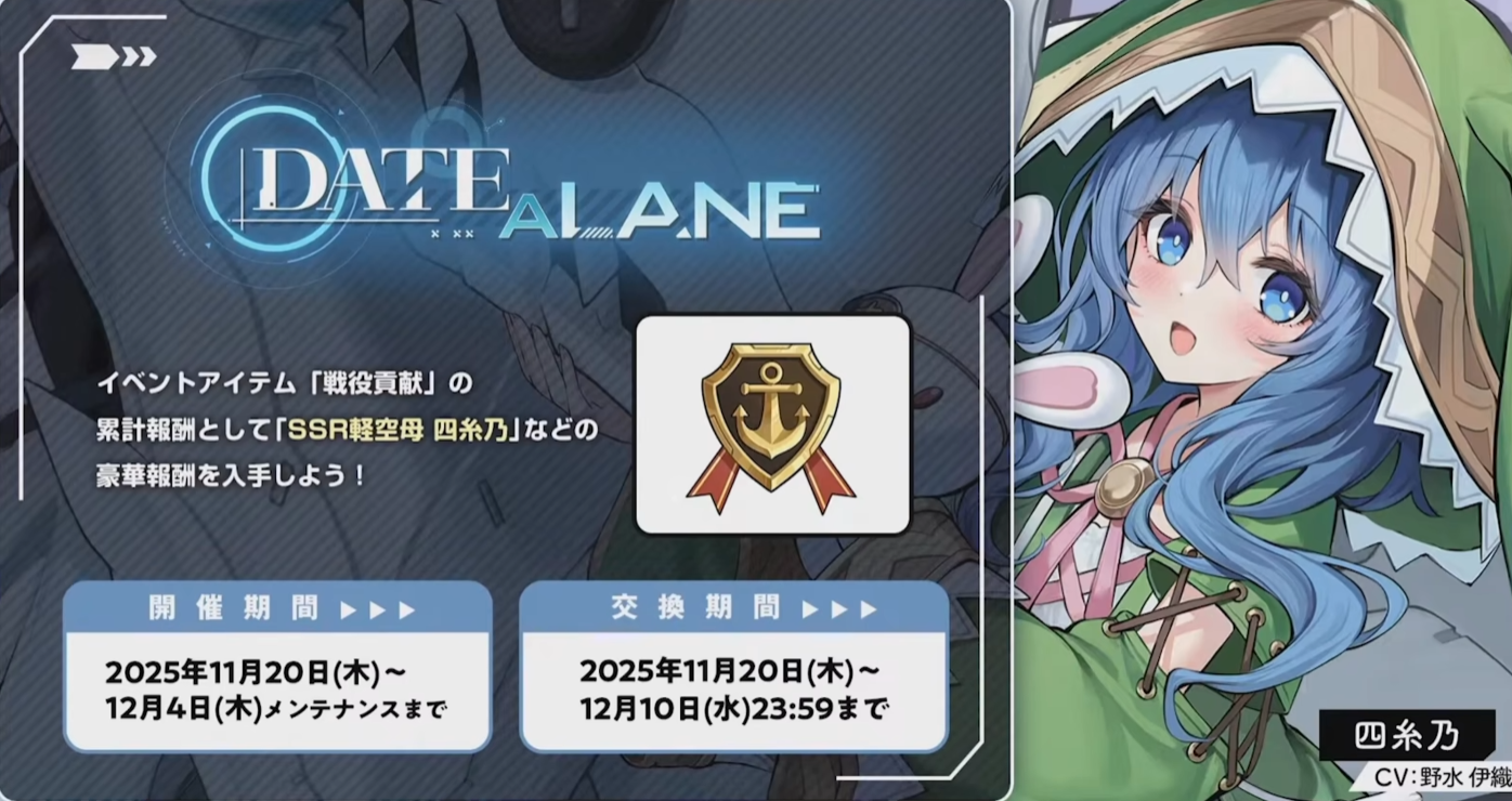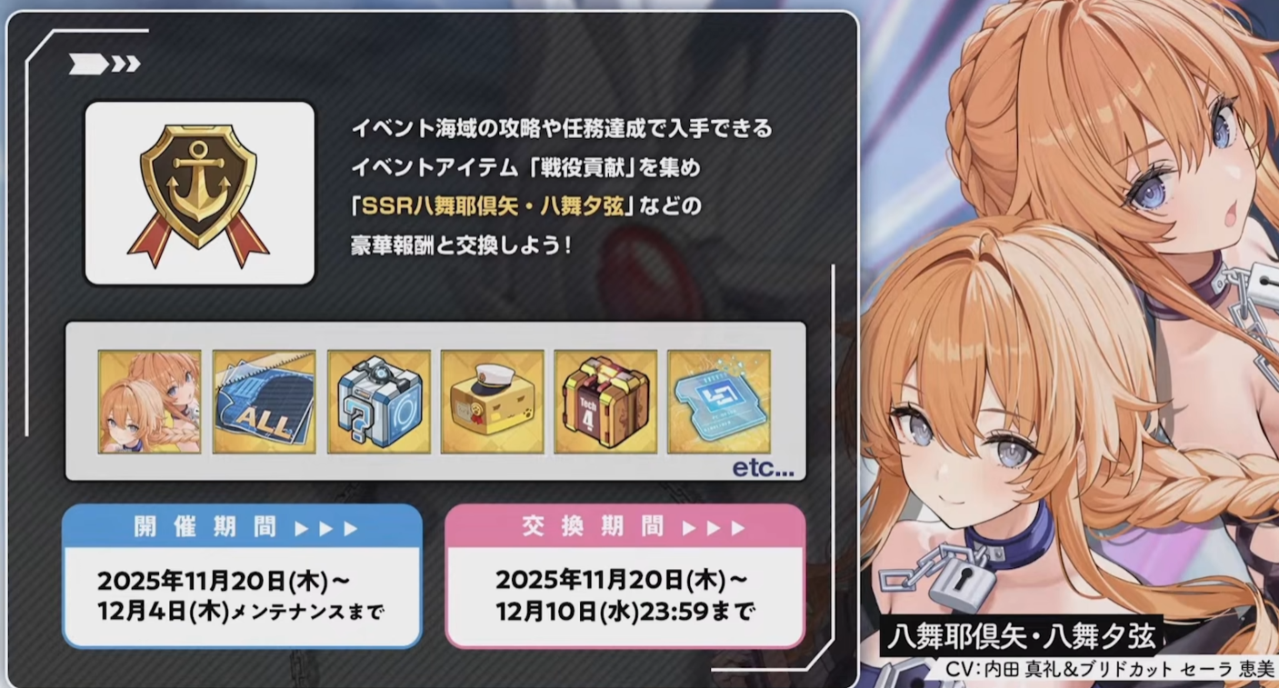 另外三位中的八舞耶俱矢·八舞夕弦(SSR轻巡,8000pt船,可打捞可兑换)、时崎狂三(活动免费获取)、四系乃(SSR轻航,pt累计奖励,无法建造)。
