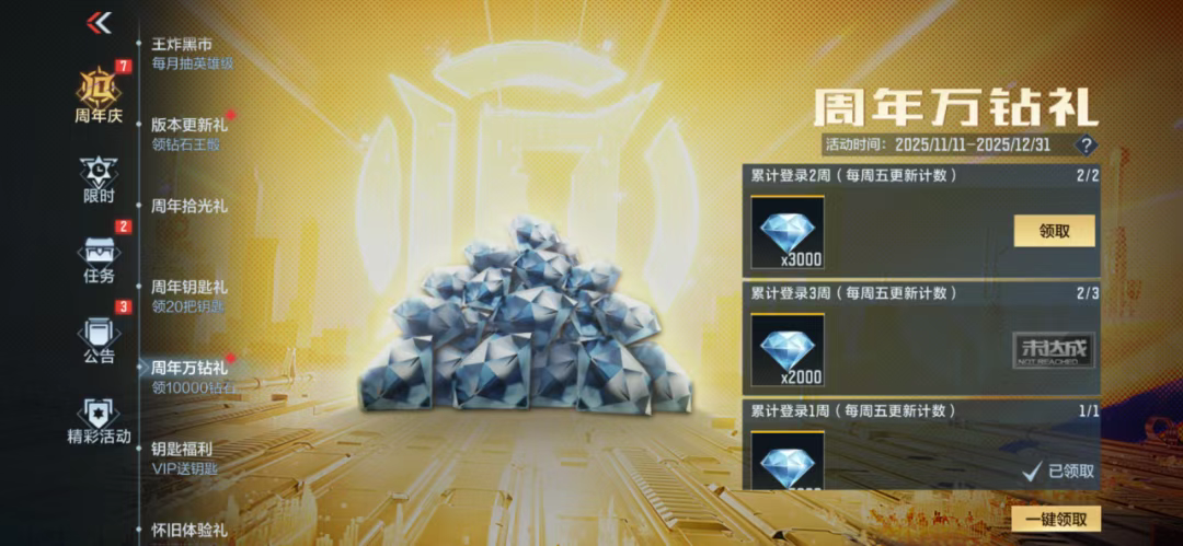 11月21日-1月15日,“周年万钻礼”活动开启。活动期间,玩家累计登录1周就领5000钻,累计登录3周领2000钻,累计登录3周再领2000钻!总共10000钻,周年庆钻石拿到手软。