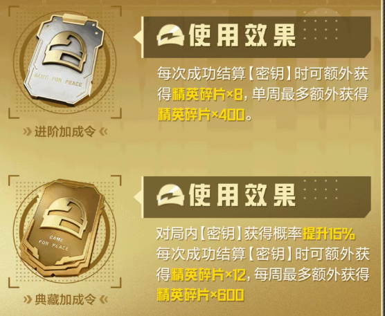在本次活动中,在“密钥”收集阶段,玩家还可以用精英碎片开通“进阶加成令”和“典藏加成令”(同时开通效果可叠加)。开通加成令后,玩家获取碎片收集进度将提升。