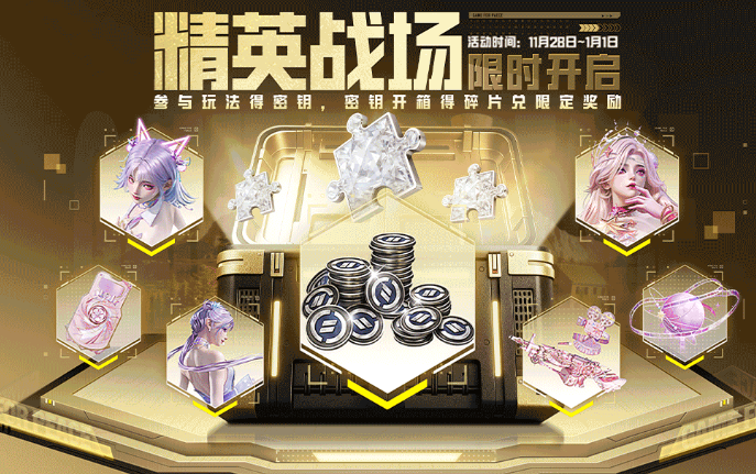 首先本次活动分为两个阶段,在11月28日-12月25日期间,属于收集阶段,玩家可通过参与制定对局来获得道具“密钥”,并使用精英碎片兑换相应奖励。“密钥”分为白、绿、蓝、紫4个品阶,品阶越高获取的精英碎片越多,低品阶的“密钥”开启时有概率提升1个品阶。