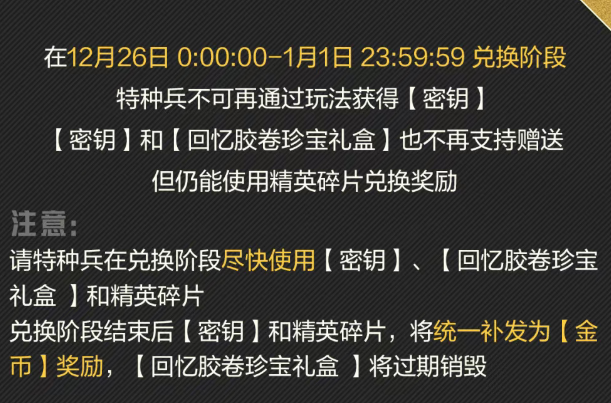 到了12月26日-1月1日,游戏将进入兑换阶段,此时“密钥”再也无法通过玩法获得,“密钥”与“回忆胶卷珍宝礼盒”虽然仍能使用精英碎片兑换,也不再支持赠送。因此建议大家一定要早点使用完这些道具,否则后续它们将被转化为“金币”奖励。