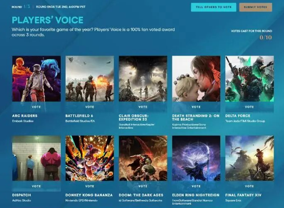 TGA2025「玩家之声」投票开启,《原神》《鸣潮》《三角洲行动》三款国产游戏入围。在去年,该奖项由《黑神话:悟空》斩获。