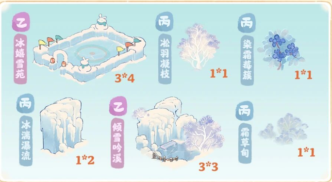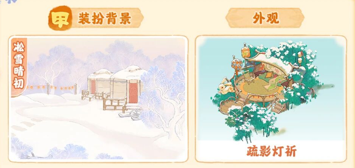 活动道具可在兑换商店中兑换装扮背景“凇雪晴初”、外观“疏影灯祈”、乙等建筑“冰嬉雪苑”、“倾雪吟溪”、多个丙等建筑、头像“笑溶冬雪”、建筑卷轴、装扮卷轴、铜钱等奖励。