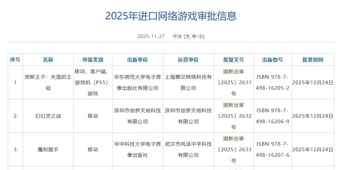 2025年12月24日,国家新闻出版署公布了2025年12月份游戏版号审批信息,共有144款国产网络游戏、3款进口网络游戏版号获批。而在12月份下放的147款游戏版号里,值得关注的重点产品有:《白银之城》、《出击吧!飞艇》、《QQ经典农场》、《大鱼碰小鱼》、《梦境守望者》、《口袋王者》等。