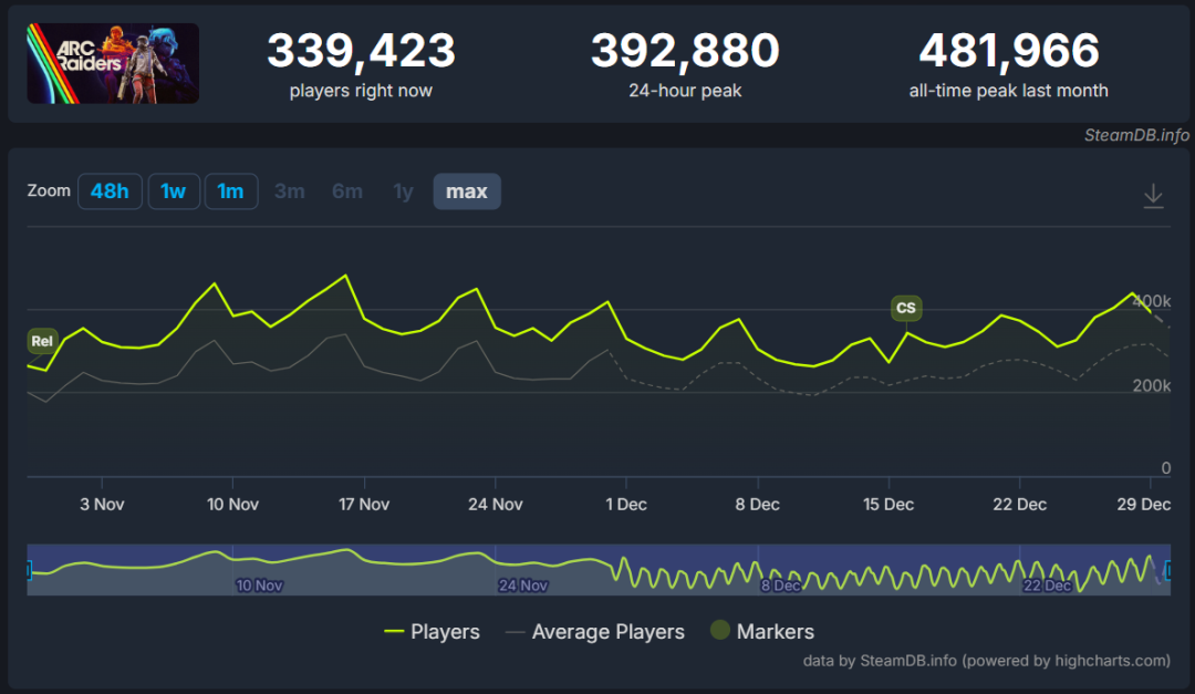 NEXON旗下Embark Studios开发的《ARC Raiders》于2025年10月30日发售,根据steamDB显示,游戏在11月16日达到了48万的玩家同时在线人数峰值,而在12月30日,该游戏的24小时内同时在线人数峰值达到了39万。