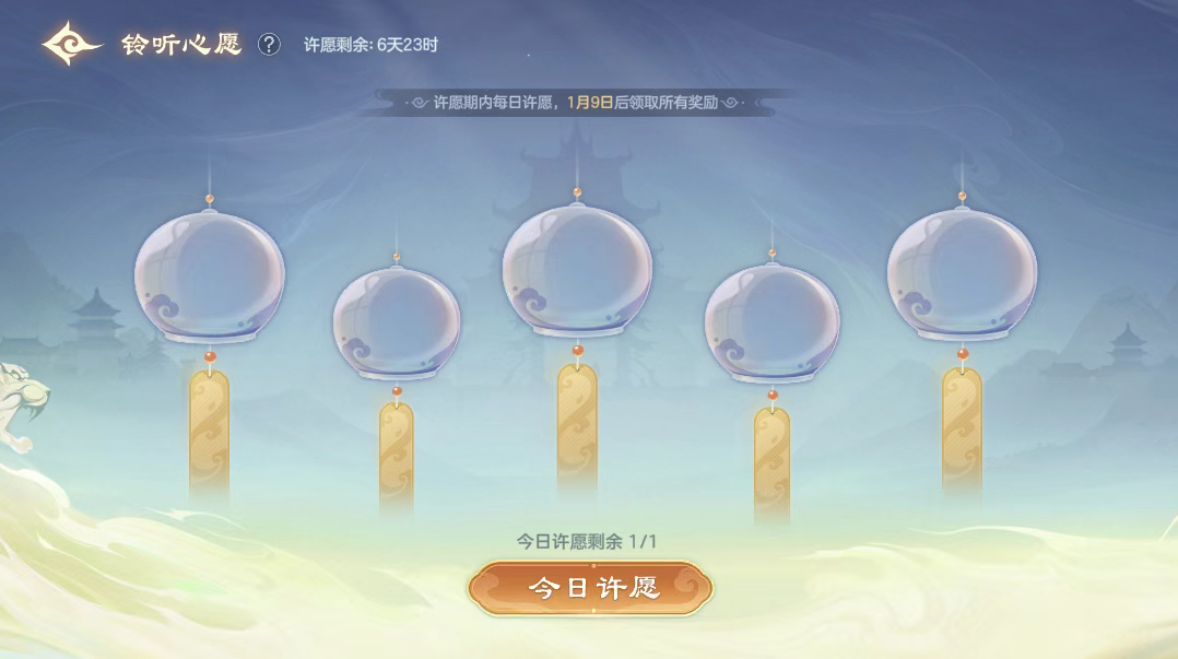 1月2日-1月12日,“铃听心愿”活动开启,许愿期间玩家每日登录可许1次愿望(最多5个)。愿望奖励包含礼券、龙魂祈福卡、皮肤碎片、寻宝签、皮肤8折龙晶折扣券、英雄6折金币折扣券等。还愿期间,可一次领取所有已许愿奖励。