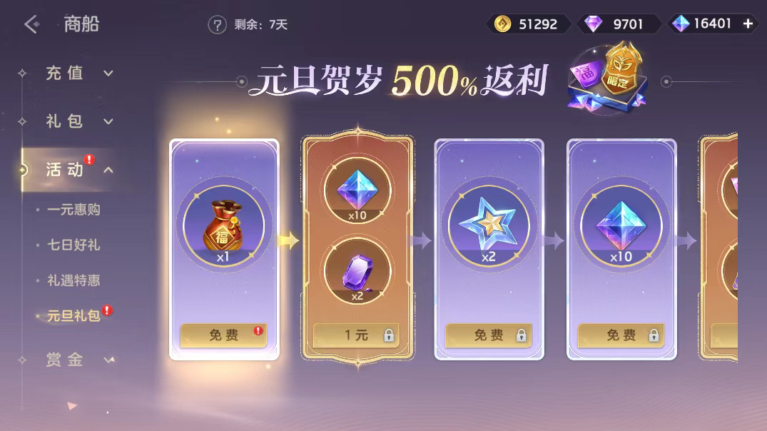 1月1日-1月9日,元旦礼包限时开售,游戏按顺序解锁礼包,可获得传说限定皮肤自选箱、元旦福袋、皮肤6折龙晶折扣券、龙晶、皮肤碎片、龙魂祈福卡等多种奖励,累计可享500%返利!