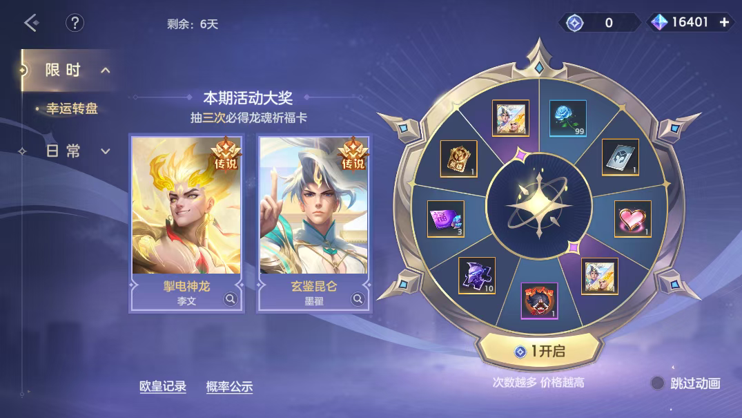 1月7日-1月14日期间,“幸运转派”限时开启,玩家使用龙晶购买幸运币,进行抽奖。李文·掣电神龙、墨翟·玄鉴昆仑、英雄自选箱、做个人吧表情、龙魂祈福卡、皮肤碎片、好感度礼包、改名卡等奖励等你来抽!最多3抽获得龙魂祈福卡,最多6抽获得1款皮肤,最多9抽获得全部奖励,前2抽抽到皮肤的守护者会获得欧皇称号。